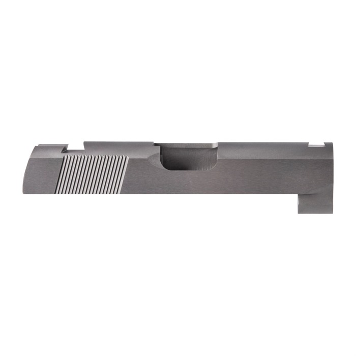 Custom-quality slides from Caspian, ready to be fitted to the frame of your choice. They start as high-quality forgings for extra strength, then are heat-treated to Rc 38-41 before machining for exceptional dimensional stability. Sides are polished, while the rest of the surface is bead-blasted for a non-glare, matte finish. Deep-cut, forward-angled rear cocking serrations prevent slippage when racking, even with a wet hand. Available in 4340 carbon steel (CS) and 416 stainless steel (SS) with .45 ACP, .40 S&W, and 9mm breechfaces. Commander and Officers models in .45 ACP only. Choose a slide without sight cuts (NC), or between two pre-cut dovetail options: a Novak Lo-Mount or Bo-Mar BMCS rear cut, both coupled with a Novak front cut. Recon slide is a Government slide with ball cuts at the front that line up with the light rail on the Caspian Recon frame (available separately). All slides require the use of a 9mm/.38 Super firing pin.