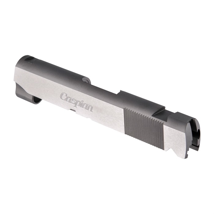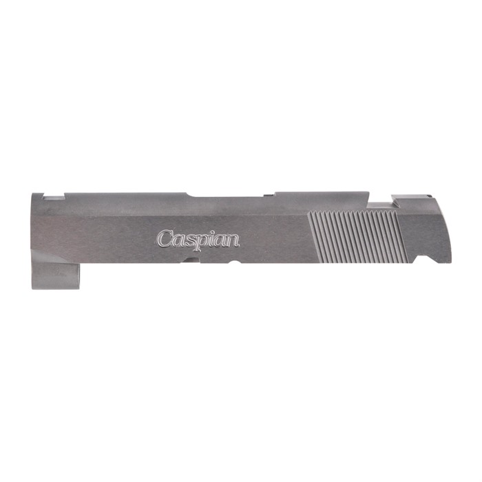 SPECS: 4340 carbon steel, in-the-white, or 416 stainless steel, natural finish. Government model accepts 5" barrel. Commander accepts 4.25" barrel. Officers model accepts 3.5" barrel. All Caspian slides require the use of a 9mm/.38 Super firing pin.