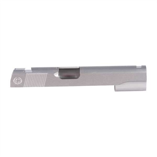Custom-quality slides from Caspian, ready to be fitted to the frame of your choice. They start as high-quality forgings for extra strength, then are heat-treated to Rc 38-41 before machining for exceptional dimensional stability. Sides are polished, while the rest of the surface is bead-blasted for a non-glare, matte finish. Deep-cut, forward-angled rear cocking serrations prevent slippage when racking, even with a wet hand. Available in 4340 carbon steel (CS) and 416 stainless steel (SS) with .45 ACP, .40 S&W, and 9mm breechfaces. Commander and Officers models in .45 ACP only. Choose a slide without sight cuts (NC), or between two pre-cut dovetail options: a Novak Lo-Mount or Bo-Mar BMCS rear cut, both coupled with a Novak front cut. Recon slide is a Government slide with ball cuts at the front that line up with the light rail on the Caspian Recon frame (available separately). All slides require the use of a 9mm/.38 Super firing pin.