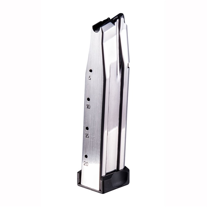 Complete, high capacity magazines. TIG welded, heat-treated, stainless steel bodies hold up to competition use without cracking or failure. All springs are tempered music wire, and fit STI bodies without trimming. Complete mags come with Polymer base pad and nylon follower for flawless feeding.