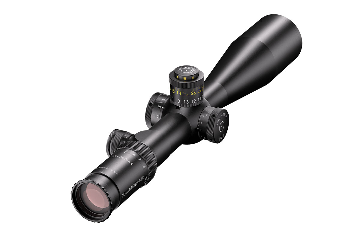 4060537065206 The 5‑25×56 PM II from Schmidt and Bender stands at the pinnacle of variable‑magnification tactical optics, engineered for long‑range precision, outstanding clarity and professional‑level reliability. With a wide 5–25× zoom range and a substantial 56 mm objective lens, it delivers exceptional light‑gathering capability, enabling crisp, bright imagery even at extended distances. Built upon a rugged 34 mm main tube, the scope accommodates large internal adjustment ranges and is designed for demanding use. It features a reticle in the first focal plane (FFP) so that scale and hold‑offs remain accurate at any magnification. The field of view spans approximately 5.3–1.5 m at 100 m, while the exit pupil ranges around 11.0–2.3 mm, and the eye relief remains generous at around 90 mm. The parallax adjustment typically extends from 10 m to infinity, enabling accurate focus from very close ranges through to extreme distances. The turret system is engineered for precision: click values as fine as 0.1 mrad (≈1 cm at 100 m) are available, and a double‑turn elevation turret combined with single‑turn windage allows vast usable correction ranges for wind and elevation. Optical transmission exceeds 90 %, and the construction is nitrogen‑filled, fog‑ and waterproof, ensuring full reliability in all climatic conditions. Key Specifications: Magnification: 5–25× Objective Lens Diameter: 56 mm Main Tube Diameter: 34 mm Field of View: approx. 5.3–1.5 m @100 m Exit Pupil: approx. 11.0–2.3 mm Eye Relief: approx. 90 mm Parallax Adjustment: from ~10 m to infinity Click Value: approx. 0.1 mrad (≈1 cm at 100 m) Optical Transmission: > 90 % Crafted in Germany to the highest standards, the 5‑25×56 PM II is the go‑to choice for military, law‑enforcement and competition shooters who demand absolute clarity, mechanical integrity and extreme flexibility in one optic.