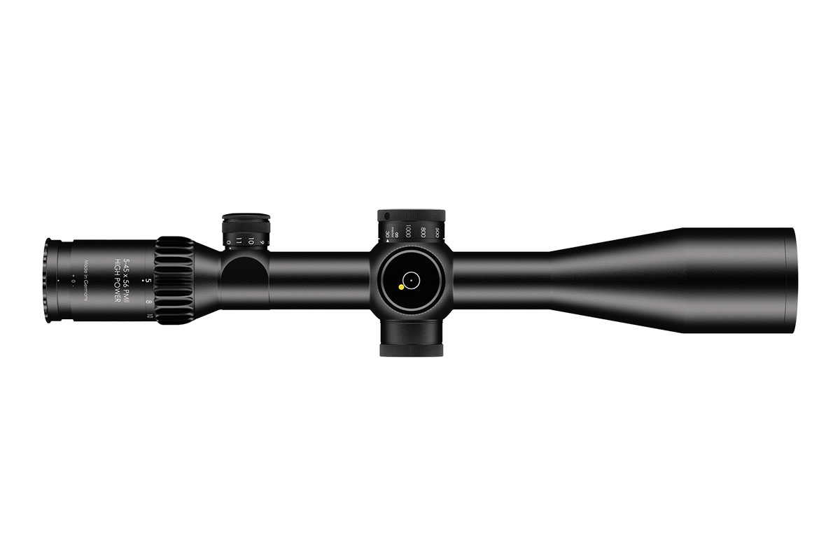 4060537062885 The 5–45×56 PM II High Power is a professional‑grade precision optic that merges a high‑performance riflescope with spotting‑scope capability. Designed for observation and ultra‑long‑range engagement, its enormous 9× zoom range (5–45×) makes it equally at home on reconnaissance, match, or tactical platforms where both identification and shot‑making accuracy are required. Engineered for extreme clarity and reach, the 56 mm objective delivers excellent light gathering while the optical system maintains a large usable field of view across the entire zoom range — allowing fast situational awareness at low magnification and razor‑sharp detail at high power. The reticle sits in the first focal plane, so hold‑offs and subtensions remain precise at any magnification. The model features robust, lockable turrets with fine 0.1 mrad click values and very large usable internal adjustment ranges tailored for extreme‑range correction. Built on a rugged 34 mm main tube, the High Power is constructed for demanding environments: it is fully weatherproof, fogproof and shock‑resistant. Despite its long reach, the design balances mechanical strength with practical ergonomics for field use. Standout Features Exceptional 5–45× magnification range for combined observation and precision shooting Large 56 mm objective for outstanding light transmission and image resolution First focal plane reticle for accurate ranging and holdover at any magnification Precision turrets with 0.1 mrad click value and extensive elevation/windage adjustment range Side/parallax adjustment for crisp focus from mid‑range to extreme distances High optical transmission (~90%) and illuminated reticle options for low‑light operations Robust 34 mm tube, weatherproof and built for professional use Key Specifications Magnification: 5–45× Objective diameter: 56 mm Main tube diameter: 34 mm Field of view: approx. 7.8–0.9 m @ 100 m Exit pupil: approx. 8.8–1.2 mm Eye relief: 90 mm Length: approx. 434 mm Weight: approx. 1,130 g Reticle: FFP (various tactical reticle options) Click value: 0.1 mrad Elevation adjustment range: ~27 mrad (internal ~29.6 mrad) Windage adjustment range: ±6 mrad (internal ~21.1 mrad) Parallax: adjustable Illumination levels: multiple (illuminated reticle available) Optical transmission: ~90% Designed and manufactured to professional standards, the 5–45×56 PM II High Power is the go‑to optic for operators and precision shooters who require unmatched versatility, extreme reach and uncompromising optical and mechanical performance.