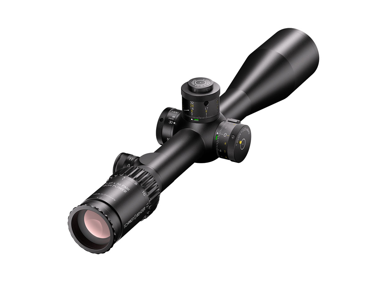 4060537027570 The 5–45×56 PM II High Power is a professional‑grade precision optic that merges a high‑performance riflescope with spotting‑scope capability. Designed for observation and ultra‑long‑range engagement, its enormous 9× zoom range (5–45×) makes it equally at home on reconnaissance, match, or tactical platforms where both identification and shot‑making accuracy are required. Engineered for extreme clarity and reach, the 56 mm objective delivers excellent light gathering while the optical system maintains a large usable field of view across the entire zoom range — allowing fast situational awareness at low magnification and razor‑sharp detail at high power. The reticle sits in the first focal plane, so hold‑offs and subtensions remain precise at any magnification. The model features robust, lockable turrets with fine 0.1 mrad click values and very large usable internal adjustment ranges tailored for extreme‑range correction. Built on a rugged 34 mm main tube, the High Power is constructed for demanding environments: it is fully weatherproof, fogproof and shock‑resistant. Despite its long reach, the design balances mechanical strength with practical ergonomics for field use. Standout Features Exceptional 5–45× magnification range for combined observation and precision shooting Large 56 mm objective for outstanding light transmission and image resolution First focal plane reticle for accurate ranging and holdover at any magnification Precision turrets with 0.1 mrad click value and extensive elevation/windage adjustment range Side/parallax adjustment for crisp focus from mid‑range to extreme distances High optical transmission (~90%) and illuminated reticle options for low‑light operations Robust 34 mm tube, weatherproof and built for professional use Key Specifications Magnification: 5–45× Objective diameter: 56 mm Main tube diameter: 34 mm Field of view: approx. 7.8–0.9 m @ 100 m Exit pupil: approx. 8.8–1.2 mm Eye relief: 90 mm Length: approx. 434 mm Weight: approx. 1,130 g Reticle: FFP (various tactical reticle options) Click value: 0.1 mrad Elevation adjustment range: ~27 mrad (internal ~29.6 mrad) Windage adjustment range: ±6 mrad (internal ~21.1 mrad) Parallax: adjustable Illumination levels: multiple (illuminated reticle available) Optical transmission: ~90% Designed and manufactured to professional standards, the 5–45×56 PM II High Power is the go‑to optic for operators and precision shooters who require unmatched versatility, extreme reach and uncompromising optical and mechanical performance.