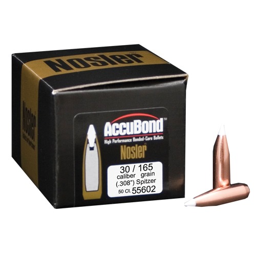 NOSLER ACCUBOND® 30 CALIBER (0.308") SPITZER BOAT TAIL RIFLE BULLETS Through a proprietary bonding process that eliminates voids in the bullet core, the AccuBond® bullet couples Nosler’s proven copper-alloy jacket with its lead-alloy core resulting in a lethally penetrating bullet that uniformly expands on impact. The bullet’s unique white polymer tip assures accuracy and smooth chambering, while the boat-tail base at the rear of the bullet acts as a platform for large diameter mushrooms. Designed for accuracy near or far, Nosler’s AccuBond® bullet provides undeniable reliability. FEATURES: White Polymer Tip Assures accuracy, smooth chambering and eliminates tip damage during recoil. Tapered Copper Alloy Jacket Lethal penetration and uniform expansion with maximum weight retention and minimal barrel fouling. Lead Alloy Core Engineered for balanced expansion. Proprietary Bonding Process Eliminates all possibility of component separation. Boat Tail Design Boat tail configuration combines with the streamlined polymer tip for long range performance and for easier loading.