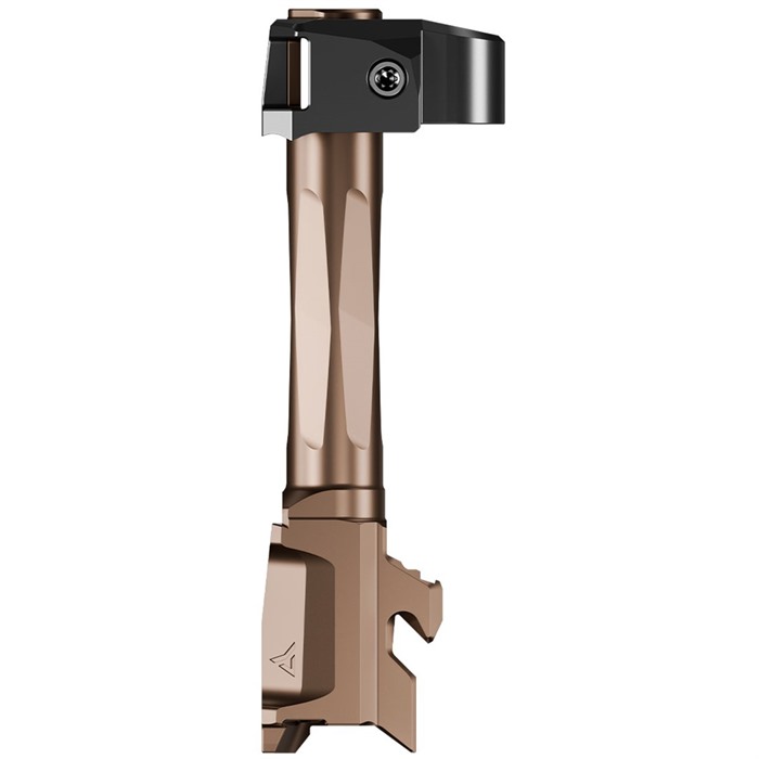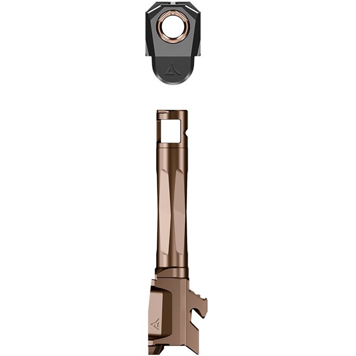 AFTERBURNER + RAMJET FOR GLOCK 43 The Radian® AFTERBURNER™ + RAMJET™ combo provide unprecedented recoil reduction and match grade accuracy in a concealed carry package. The threadless barrel design allows for effortless install/removal for cleaning, while LEGAL FOR SALE IN ALL 50 STATES*. The AFTERBURNER™ compensator is machined from hardened stainless steel and the RAMJET™ barrel from hardened 416R SS; both are enhanced with a Radianite™ coating. This combination achieves low friction, high hardness, and high corrosion resistance, making overall durability and erosion from muzzle blast a non-issue. Angled front faces on the AFTERBURNER aid in holstering. The INTRA-LOK® mounting system uses the taper lock principle; a tapered locking screw interfaces with an angled V-groove on the underside of the barrel. This perfectly times the compensator as it locks down onto the upper barrel profile on the muzzle end of the barrel. INTRA-LOK® allows the user to simply slide the compensator over the barrel, insert and tighten the locking screw, making for a simple and repeatable installation process. This system allows the user to easily remove the barrel from the slide for cleaning. DISCLAIMER: “GLOCK” is a federally registered trademark of GLOCK, Inc. and is one of many trademarks owned by GLOCK, Inc. or GLOCK Ges.m.b.H. Neither Brownells nor this site are affiliated in any manner with, or otherwise endorsed by, GLOCK, Inc. or GLOCK Ges.m.b.H. The use of “GLOCK” on this page is merely to advertise the sale of GLOCK pistols, parts, or components. For genuine GLOCK, Inc. and GLOCK Ges.m.b.H. products and parts visit www.glock.com.