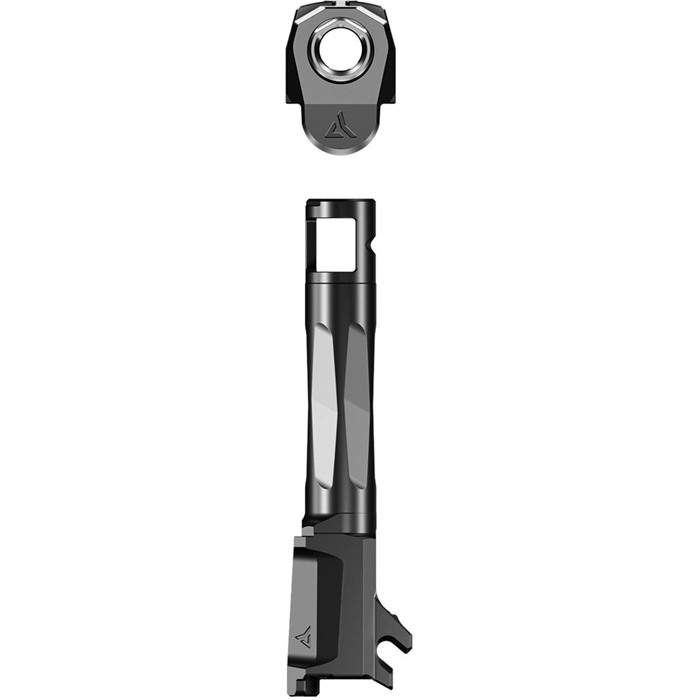 The Radian® AFTERBURNER™ + RAMJET™ combo provide unprecedented recoil reduction and match grade accuracy in a concealed carry package. The threadless barrel design allows for effortless install/removal for cleaning, while LEGAL FOR SALE IN ALL 50 STATES*. The AFTERBURNER™ compensator is machined from hardened stainless steel and the RAMJETTM barrel from hardened 416R SS; both are enhanced with a Radianite Black coating. This combination achieves low friction, high hardness, and high corrosion resistance, making overall durability and erosion from muzzle blast a non-issue. Angled front faces on the AFTERBURNER™ aid in holstering. The INTRA-LOK® mounting system uses the taper lock principle; a tapered locking screw interfaces with an angled V-groove on the underside of the barrel. This perfectly times the compensator as it locks down onto the upper barrel profile on the muzzle end of the barrel. INTRA-LOK® allows the user to simply slide the compensator over the barrel, insert and tighten the locking screw, making for a simple and repeatable installation process. This system allows the user to easily remove the barrel from the slide for cleaning. FEATURES AFTERBURNER™ Hardened SS RAMJET™ Hardened 416R SS atch Grade Barrel Gas Sealing Chamber Loaded Chamber Indicator