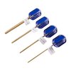 SPECS: Handle - Plastic. Shank - Unhardened steel drill rod, or 360 alloy brass . 3¼” (8.2cm) long. OAL - 4¾” (12.1cm) long. Alignment/Push Punch Set - Contains (4) brass and (4) steel punches, (1) brass and (1) steel of each diameter: .092” (2.3mm), .120” (3mm), .151” (3.8mm), and .246” (6.2mm). Bench Block - Delrin, tan. 63⁄8” (16cm) long, 3” (7.6cm) wide, ¾” (1.9cm) high. Holds 8 punches.