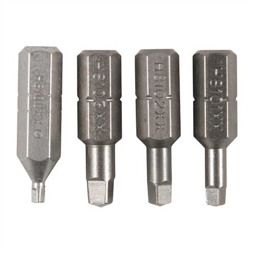 All are our standard 1" (2.5cm) long, ¼" (6.3mm) hex shank bits. Phillips bits are NOT anti-cam. Square socket screws are in RV s, cabinets, other places. 1⁄8" square fits newer Remington butt plates.