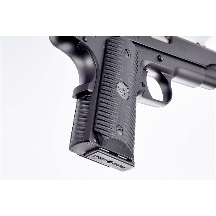 The ACP is built with our highest quality parts in the same time-tested way as our other custom 1911 handguns, but with reduced customer selected options that streamlines our production and enables a lower price to the end user. Available in .45 ACP and 9mm Luger calibers, the ACP features our latest generation forged slide, frame and barrels that are hand fitted by our skilled pistolsmiths with our 100% machined Bullet Proof parts for a lifetime of high performance. The ACP retains the best-in-class Wilson Combat 100% Customer Satisfaction Guarantee for the lifetime of the product. The ACP also introduces the new Eagle Claw grip and slide surface to set it apart from the rest of the pack.The Eagle Claw pattern offers a non-abrasive, tactile grip under adverse conditions but is still easy on your hands and clothing during extended range trips and every day carry. The unique look and feel of the Eagle Claw is like nothing else we have produced. Available in Full-Size 5", 4.25” Commander or 4” Compact sizes in Armor Tuff® finished carbon steel with limited customer selected options available, the ACP brings Wilson Combat quality to more American shooters than ever before.