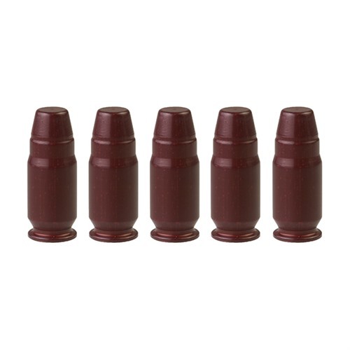 Diese Dummy-Rounds sind aus einem präzise bearbeiteten Aluminiumkörper mit einem synthetischen, gepolsterten Zündsatz gefertigt, der wiederholtem Zyklen standhält. Sie sind so geformt, dass sie wie geladene Patronen aussehen, was ein korrektes Laden und Zuführen ermöglicht.