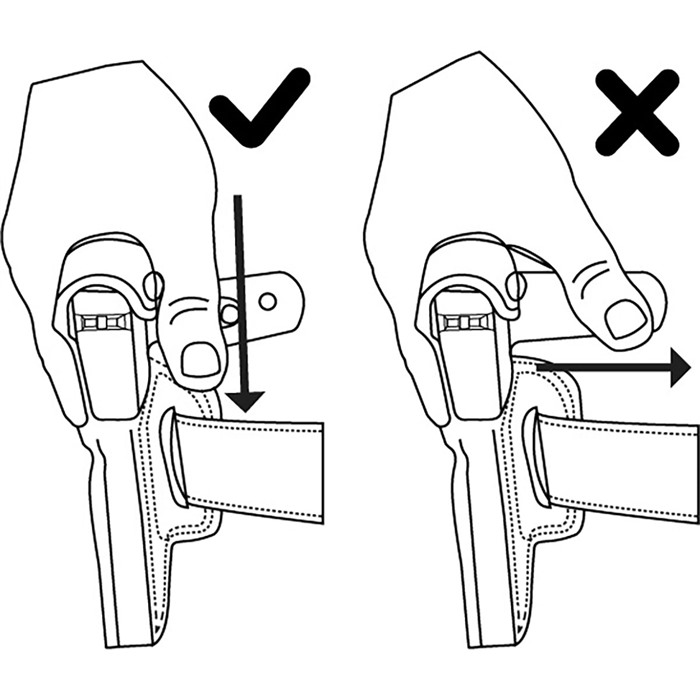 Zusätzlichen Komfort erhältst du durch die Schafslederpolsterung zwischen Holster und Knöchel. Die Geschwindigkeit beim Ziehen wird durch den verstärkten Daumenbrems-Riemen verbessert. Das Holster passt sich Knöcheln mit einem Umfang von bis zu 13" an.