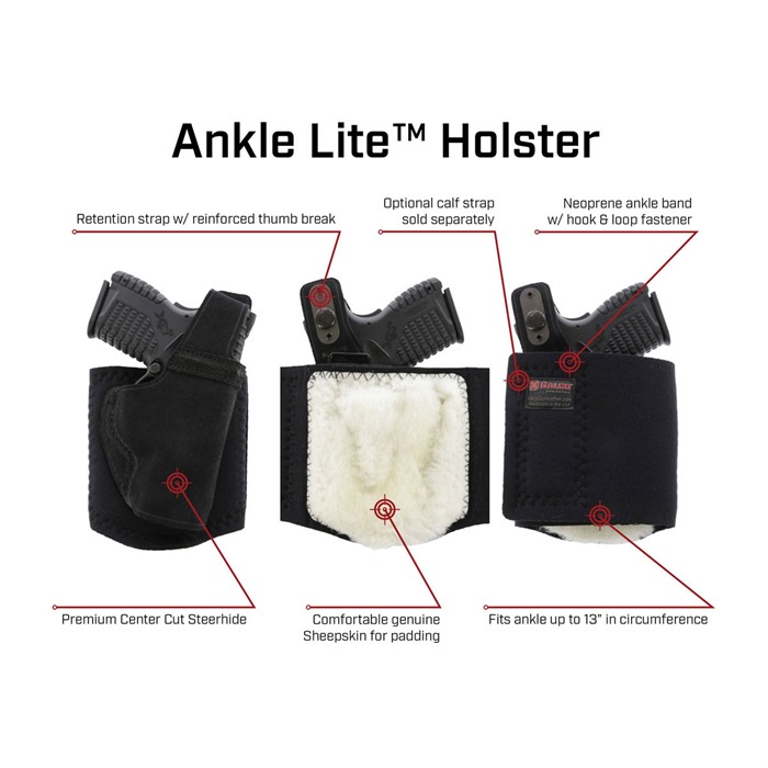 Using the same wide neoprene ankle band and Velcro closure as the Ankle Glove with Center Cut Steerhide™ for the holster, the Ankle Lite combines extended wearing comfort with unmatched security. Additional comfort is provided by sheepskin padding between the holster and ankle, while speed of draw is enhanced with a reinforced thumb break retention strap. Accommodates ankles up to 13" in circumference.