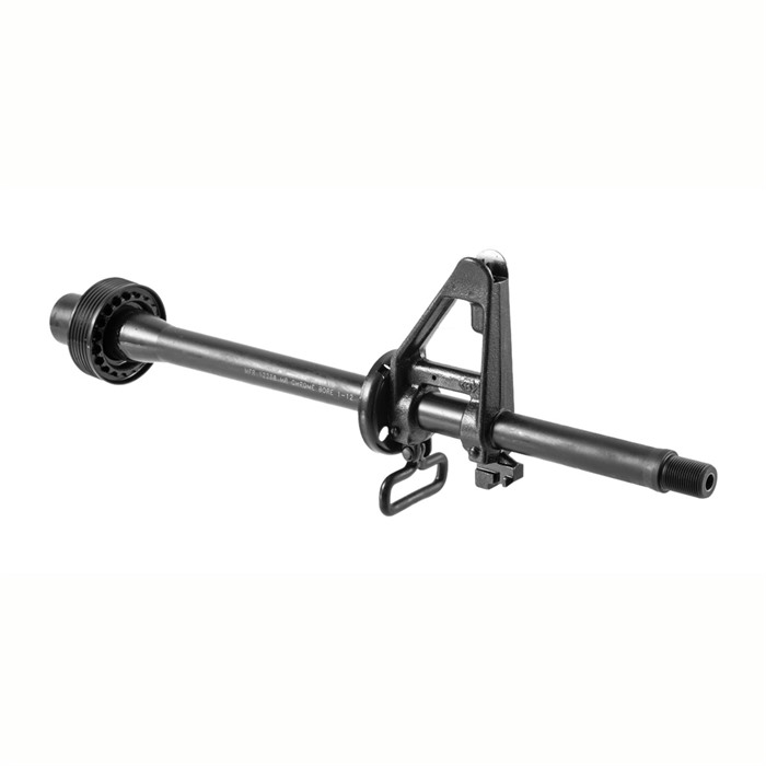 Introducing the Brownell’s Retro A1 12.7" carbine length barrel assembly. Chambered in 5.56x45mm NATO, the chrome lined barrel is available with your choice of 1-7" or 1-12" rifling and finished in black phosphate with an overall length of 12.7”. Muzzle threads are ½""-28, and in back there's a standard barrel extension. Each Retro A1 12.7" carbine barrel assembly includes a front-sight base, .625", no F marks, complete with sight post, detent, spring, sling swivel, rivet, flat Delta ring, barrel nut, weld spring, snap ring, and round handguard cap installed. Machined from 4150 chrome moly steel. The barrel you need for your next Retro Rifle build!