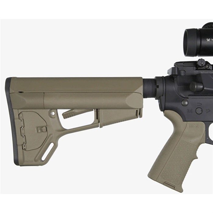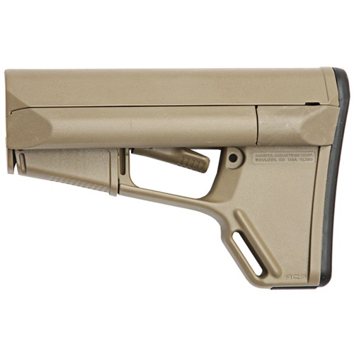 Adaptable Carbine/Storage (ACS) stock is a drop-in replacement for standard USGI M4 collapsible stock that gives the tactical operator extra storage options, a secure, comfortable cheekweld, and an advanced dual-locking lever. Smooth, streamlined exterior contours prevent snagging on clothing, sling, or vegetation, and help ensure fast exits from vehicles without snagging on gear. Removable battery storage compartments run the full length of the extra-wide comb and hold 2 AA or 3 CR-123 batteries, while providing a wide, contoured area for an exceptionally solid, comfortable cheekweld. Secure molded rubber caps keep water and dust out of compartments and face the rear of the stock for easy removal; cap exterior is beveled to resist snagging when shouldering weapon. Positive-locking trapdoor on right side of the stock reveals a roomy storage compartment for additional batteries, coiled up cleaning cable and other cleaning supplies, ear plugs, spare parts, or other small items. Magpul’s dual locking system uses an additional cam lever to protect the release lever from accidental operation, yet still allows you to adjust length of pull by simply pushing on the release lever. Slot molded in the toe provides an attachment point for a 1¼" wide sling. Also includes the same detachable rubber buttpad found on Magpul CTR and UBR buttstocks to help keep stock firmly mounted on shoulder. Mil-Spec fits 1.14" O.D. buffer tubes on Colt-manufactured M4 and similar mil-spec tubes that accept both four- and six-position collapsible stocks.