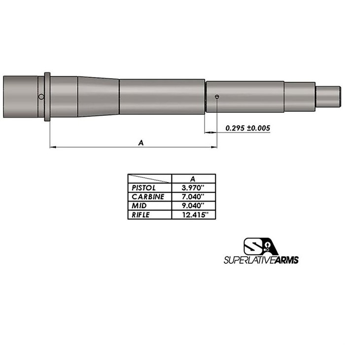 SUPERLATVIE ARMS LLC AR-15 ADJUSTABLE PISTON SYSTEM W/CLAMP 0.625" BLOCK LEFT HAND The Superlative Arms Patented Bleed Off® Mode, gas piston system for the AR-15 platform adjusts the gas flow by bleeding the gas out the front of the block instead of restricting the flow like conventional adjustable blocks. RESULTS: The pressure used in the block is reduced only to the amount required to drive the bolt carrier. The remaining gas and pressure are bled out of the block allowing the system to run much cleaner and cooler. Reduction of wear on the bolt carrier group components and upper receiver. Reduction of felt recoil allowing for faster follow-up shots. Patented adjustment detent is located outside of the block and therefore no contamination. In Bleed Off Mode the gas adjustment screw does not restrict the gas flow; therefore, there is no erosion or seizing of the screw, and no loss of detent due to carbon build up. Although it is removable, we have added a safety mechanism, which stops you from unintentionally backing the screw all the way out. When using SBR’s and/or suppressors the Bleed Off port allows the excessive pressure to be exhausted out of the block reducing blow back. NOTE: The Superlative Arms Piston Kit does not come with a Bolt Assembly (bolt, cam pin, firing pin, or firing pin retainer). Bolt Assembly sold separately. ***NOTICE: PRIOR TO PURCHASING THIS PRODUCT*** Please review the barrel schematic for the critical dimensions necessary to safely operate the pistol length piston system. There is no industry standard for the distance between the barrel extension to the center of the gas hole. This is critical for the op rod length. If it is not the same distance as stated on the schematic, you may bend the op rod. THIS PRODUCT IS NOT RATED FOR 300 BLK!!! SPECIFICATIONS: Piston Systems: Piston Kits Gas Block Size: .625 Gas Block Style: Clamp On Gas System Length: Pistol Carrier Type: Full-Auto, AR-15 Carrier Finish: Dark DLC