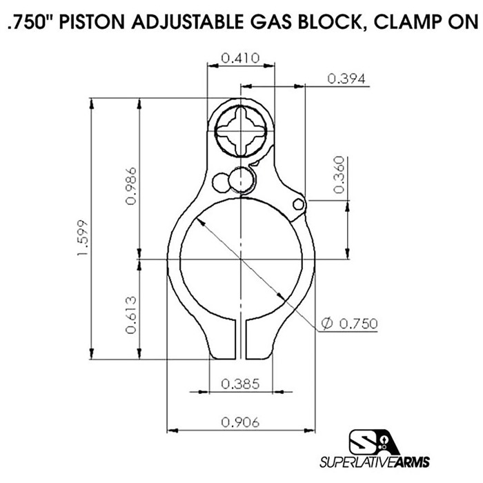 AR-15 ADJUSTABLE PISTON SYSTEM W/CLAMP .750" BLOCK LEFT HAND The Superlative Arms Patented Bleed Off® Mode, gas piston system for the AR-15 platform adjusts the gas flow by bleeding the gas out the front of the block instead of restricting the flow like conventional adjustable blocks. RESULTS: The pressure used in the block is reduced only to the amount required to drive the bolt carrier. The remaining gas and pressure are bled out of the block allowing the system to run much cleaner and cooler. Reduction of wear on the bolt carrier group components and upper receiver. Reduction of felt recoil allowing for faster follow-up shots. Patented adjustment detent is located outside of the block and therefore no contamination. In Bleed Off Mode the gas adjustment screw does not restrict the gas flow; therefore, there is no erosion or seizing of the screw, and no loss of detent due to carbon build up. Although it is removable, we have added a safety mechanism, which stops you from unintentionally backing the screw all the way out. When using SBR’s and/or suppressors the Bleed Off port allows the excessive pressure to be exhausted out of the block reducing blow back. NOTE: The Superlative Arms Piston Kit does not come with a Bolt Assembly (bolt, cam pin, firing pin, or firing pin retainer). Bolt Assembly sold separately. ***NOTICE: PRIOR TO PURCHASING THIS PRODUCT*** Please review the barrel schematic for the critical dimensions necessary to safely operate the pistol length piston system. There is no industry standard for the distance between the barrel extension to the center of the gas hole. This is critical for the op rod length. If it is not the same distance as stated on the schematic, you may bend the op rod. THIS PRODUCT IS NOT RATED FOR 300 BLK!!! SPECIFICATIONS: Piston Systems: Piston Kits Gas Block Size: .750 Gas Block Style: Clamp On Gas System Length: Pistol Carrier Type: Full-Auto, AR-15 Carrier Finish: Dark DLC