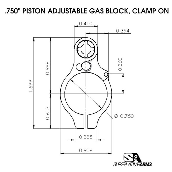 SUPERLATIVE ARMS LLC AR-15 ADJUSTABLE PISTON SYSTEM W/CLAMP ON .750" BLOCK RIGHT HAND The Superlative Arms Patented Bleed Off® Mode, gas piston system for the AR-15 platform adjusts the gas flow by bleeding the gas out the front of the block instead of restricting the flow like conventional adjustable blocks. RESULTS: The pressure used in the block is reduced only to the amount required to drive the bolt carrier. The remaining gas and pressure are bled out of the block allowing the system to run much cleaner and cooler. Reduction of wear on the bolt carrier group components and upper receiver. Reduction of felt recoil allowing for faster follow-up shots. Patented adjustment detent is located outside of the block and therefore no contamination. In Bleed Off Mode the gas adjustment screw does not restrict the gas flow; therefore, there is no erosion or seizing of the screw, and no loss of detent due to carbon build up. Although it is removable, we have added a safety mechanism, which stops you from unintentionally backing the screw all the way out. When using SBR’s and/or suppressors the Bleed Off port allows the excessive pressure to be exhausted out of the block reducing blow back. NOTE: The Superlative Arms Piston Kit does not come with a Bolt Assembly (bolt, cam pin, firing pin, or firing pin retainer). Bolt Assembly sold separately. ***NOTICE: PRIOR TO PURCHASING THIS PRODUCT*** Please review the barrel schematic for the critical dimensions necessary to safely operate the pistol length piston system. There is no industry standard for the distance between the barrel extension to the center of the gas hole. This is critical for the op rod length. If it is not the same distance as stated on the schematic, you may bend the op rod. THIS PRODUCT IS NOT RATED FOR 300 BLK!!! SPECIFICATIONS: Piston Systems: Piston Kits Gas Block Size: .750 Gas Block Style: Clamp On Gas System Length: Pistol Carrier Type: Full-Auto, AR-15 Carrier Finish: Dark DLC