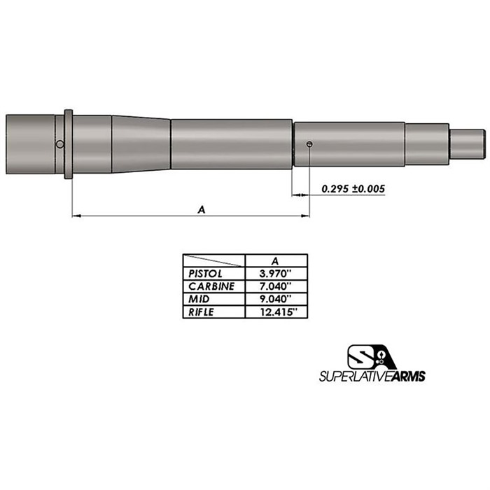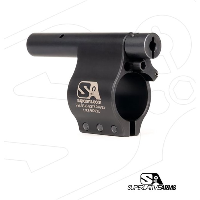 AR-15 ADJUSTABLE PISTON SYSTEM W/CLAMP .750" BLOCK LEFT HAND The Superlative Arms Patented Bleed Off® Mode, gas piston system for the AR-15 platform adjusts the gas flow by bleeding the gas out the front of the block instead of restricting the flow like conventional adjustable blocks. RESULTS: The pressure used in the block is reduced only to the amount required to drive the bolt carrier. The remaining gas and pressure are bled out of the block allowing the system to run much cleaner and cooler. Reduction of wear on the bolt carrier group components and upper receiver. Reduction of felt recoil allowing for faster follow-up shots. Patented adjustment detent is located outside of the block and therefore no contamination. In Bleed Off Mode the gas adjustment screw does not restrict the gas flow; therefore, there is no erosion or seizing of the screw, and no loss of detent due to carbon build up. Although it is removable, we have added a safety mechanism, which stops you from unintentionally backing the screw all the way out. When using SBR’s and/or suppressors the Bleed Off port allows the excessive pressure to be exhausted out of the block reducing blow back. NOTE: The Superlative Arms Piston Kit does not come with a Bolt Assembly (bolt, cam pin, firing pin, or firing pin retainer). Bolt Assembly sold separately. ***NOTICE: PRIOR TO PURCHASING THIS PRODUCT*** Please review the barrel schematic for the critical dimensions necessary to safely operate the pistol length piston system. There is no industry standard for the distance between the barrel extension to the center of the gas hole. This is critical for the op rod length. If it is not the same distance as stated on the schematic, you may bend the op rod. THIS PRODUCT IS NOT RATED FOR 300 BLK!!! SPECIFICATIONS: Piston Systems: Piston Kits Gas Block Size: .750 Gas Block Style: Clamp On Gas System Length: Pistol Carrier Type: Full-Auto, AR-15 Carrier Finish: Dark DLC