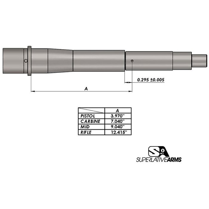 SUPERLATIVE ARMS LLC AR-15 ADJUSTABLE PISTON SYSTEM W/0.750" GAS BLOCK LEFT HAND The Superlative Arms patent pending “Bleed Off”, direct impingement, gas block for the AR15 platform adjusts the gas flow by bleeding the gas out of the block instead of restricting the flow like conventional adjustable blocks. NOT RATED FOR 300 BLACKOUT IN PISTOL LENGTH Results: The pressure used in the block is reduced only to the amount required to drive the bolt carrier. The remaining gas / pressure are bled out of the block allowing the system to run much cleaner and cooler. Reduction of felt recoil. Patented adjustment detent is located outside of the block and therefore no contamination. The gas adjustment screw does not restrict the gas flow; therefore there is no erosion or seizing of the screw / no loss of detent due to carbon build up. Although it is removable, we have added a safety mechanism, which stops you from unintentionally backing the screw all the way out. When using SBR’s and / or suppressors the bleed off port allows the excessive pressure to be exhausted out of the block reducing blow back. DATA: Firearm Type: AR15 Gas Length: Pistol, Carbine, Mid-Length, and Rifle Weight: 12.8 oz., 13.1 oz, 13.4 oz, and 13.8 oz Piston Block Attachment Type: Clamp On, Socket Head Cap Screws Piston Block Material and Finish: 416 SS, Melonite Carrier: Ion Bonded, 1 pc. Carrier w/ Skis and Dimpled Key Gas Adjustment: 30 Locked Positions, Front Of Block Bleed Off Port: Front Of Block INCLUDED: Piston Block Assembly Carrier (bolt not included). (1) 3/32" X 6" Hex Key (tool to adjust gas screw) (1) 9/64" X 6" Hex key (tool to install/remove gas block plug) (1) Bushing and insert tool Installation Instructions & QR Code For Video Tutorial