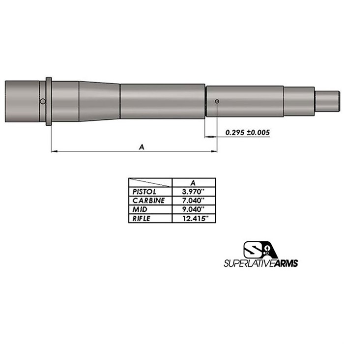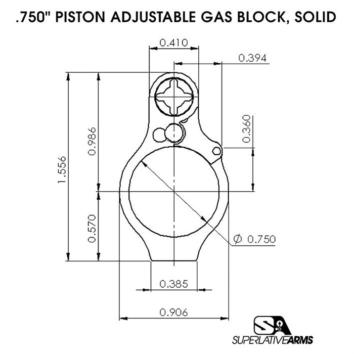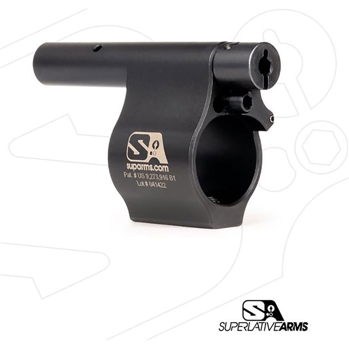 SUPERLATIVE ARMS LLC RIGHT HAND ADJUSTABLE PISTON SYSTEM W/0.750" GAS BLOCK FOR AR-15 The Superlative Arms patent pending “Bleed Off”, direct impingement, gas block for the AR15 platform adjusts the gas flow by bleeding the gas out of the block instead of restricting the flow like conventional adjustable blocks. NOT RATED FOR 300 BLACKOUT IN PISTOL LENGTH Results: The pressure used in the block is reduced only to the amount required to drive the bolt carrier. The remaining gas / pressure are bled out of the block allowing the system to run much cleaner and cooler. Reduction of felt recoil. Patented adjustment detent is located outside of the block and therefore no contamination. The gas adjustment screw does not restrict the gas flow; therefore there is no erosion or seizing of the screw / no loss of detent due to carbon build up. Although it is removable, we have added a safety mechanism, which stops you from unintentionally backing the screw all the way out. When using SBR’s and / or suppressors the bleed off port allows the excessive pressure to be exhausted out of the block reducing blow back. DATA: Firearm Type: AR15 Gas Length: Pistol, Carbine, Mid-Length, and Rifle Weight: 12.8 oz., 13.1 oz, 13.4 oz, and 13.8 oz Piston Block Attachment Type: Clamp On, Socket Head Cap Screws Piston Block Material and Finish: 416 SS, Melonite Carrier: Ion Bonded, 1 pc. Carrier w/ Skis and Dimpled Key Gas Adjustment: 30 Locked Positions, Front Of Block Bleed Off Port: Front Of Block INCLUDED: Piston Block Assembly Carrier (bolt not included). (1) 3/32" X 6" Hex Key (tool to adjust gas screw) (1) 9/64" X 6" Hex key (tool to install/remove gas block plug) (1) Bushing and insert tool Installation Instructions & QR Code For Video Tutorial