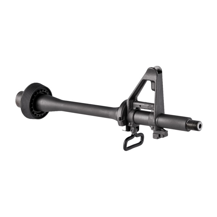 Brownells Government Barrel Assemblies – Chrome Lined and Individually Inspected The Brownells Government Barrel Assemblies are manufactured by a US Government Contractor for M4 barrels, and held to exacting standards. These barrels all feature a hard chrome bore, applied over button rifling. Each barrel is High Pressure Tested, followed by Magnetic Particle Inspection & Gauging to ensure there are absolutely zero imperfections. Assemblies are as ready-to-install as possible, with slip ring assembly, F-Marked front sight base and handguard cap pre-installed. Handguard caps are appropriate for the barrel length, with M4 Carbine assemblies featuring a round cap, and the rifle length featuring the proper triangle. Barrel material is 4150 chrome moly steel. 5.56x45mm chamber and 1-7 twist will ensure acceptance and desired performance with 62 grain and greater bullets. Barrels are all marked: “5.56x45mm NATO MFR 12238 MP HP 1-7”.
