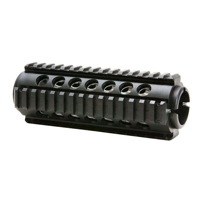 Der zwei-teilige Quad Rail Handguard ist aus glasfaserverstärktem Nylonpolymer gefertigt, einem hochimpactfähigen Material, das dafür ausgelegt ist, die Belastungen beim Schießen auf dem Schießstand und im Feld zu bewältigen. Die mil-spec Rails befinden sich an den Positionen 9, 12, 3 und 6 Uhr rund um den Handguard. Jede Handguard-Hälfte verfügt außerdem über Aluminium-Wärmeschutz-Einsätze, die die Unterstützungshand des Schützen vor der Wärme des Laufs schützen.