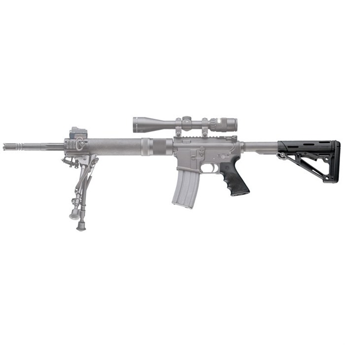 Hogue’s 2 Piece Kit contains a finger grooved beavertail rubber grip and a collapsible buttstock. The beavertail grip is specifically designed to retain the important lines and aesthetics of tactical rifles. It provides a comfortable grip with palm swells and and features Hogue’s exclusive Cobblestone™ pattern. Hogue’s OverMolded® collapsible buttstock features reinforced polymer construction with a rubber cheek rest and a rubber/polymer hybrid butt pad that provides snag-free shouldering. This unique design creates a snug anti-rattle friction fit that prevents unwanted movement along the buffer tube. The buttstock provides multiple swivel sleeve and sling mounting locations.