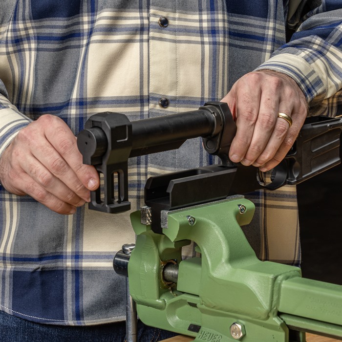 Mit dem AR-15 LOWER RECEIVER BUFFER TUBE VISE FIXTURE von BROWNELLS kannst du deinen Buffer Tube gerade halten, während du die Castle Nut anziehst. Hier bei Brownells wissen wir, wie schwierig es ist, die Castle Nut des unteren Empfängers anzuziehen, ohne dass sich der Buffer Tube während des Aufbaus oder der Wartung einer AR-15 Plattform dreht. Deshalb haben wir die AR-15 Lower Receiver Extension Vise Fixture entwickelt.
