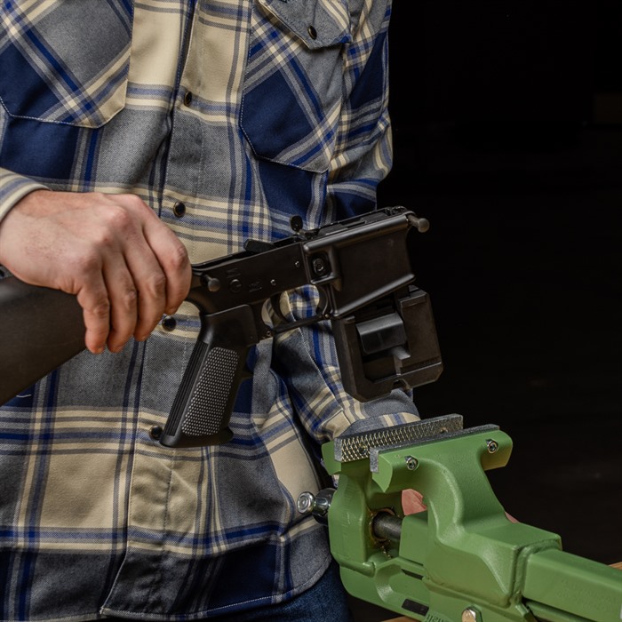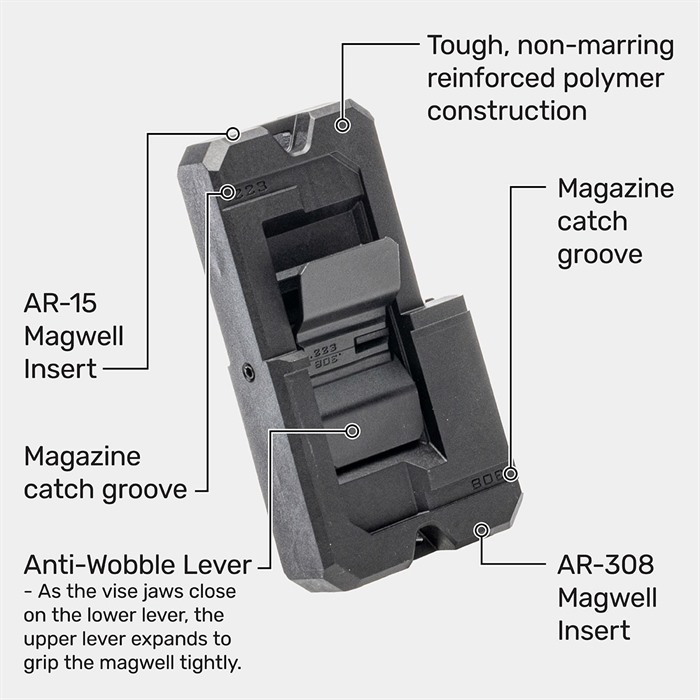 Hergestellt aus nicht verkratzendem Polymer, hält unser Vise Block deinen unteren Empfänger sicher und stabil. Mit einer Anti-Wobble-Funktion kannst du ihn problemlos in einem Bench Vise wie dem Brownells Bench Vise verwenden. Der Vise Block ist mit einer Magazine Catch Groove ausgestattet und passt auf die meisten AR-10 und AR-15 Magazine Wells.