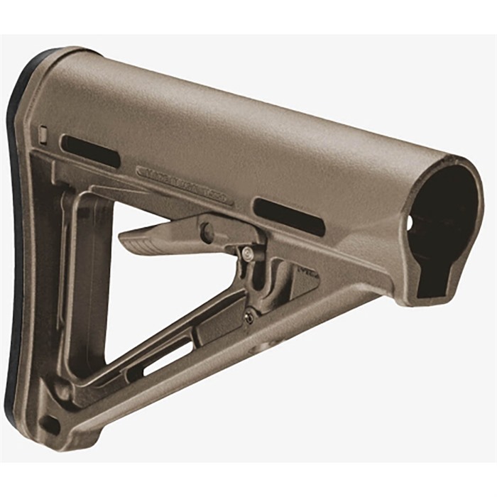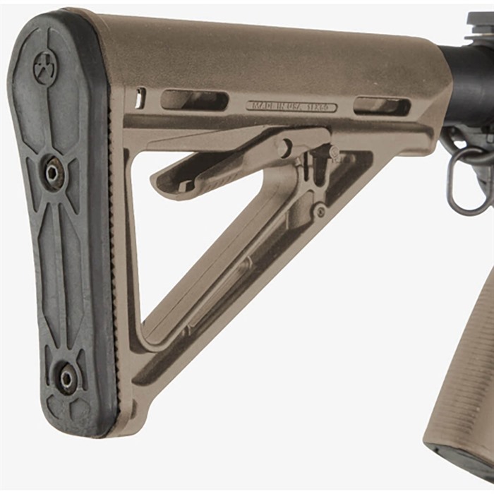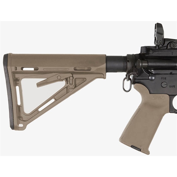 Magpul Original Equipment (MOE) carbine buttstock provides the quality, durability, and ergonomic benefits of Magpul’s CTR stock in a rugged, economical, drop-in package. Strong, A-frame design is lightweight and comfortable, yet provides operator with plenty of support. Comb contour is wider than standard issue M4 stock to help shooter maintain a solid, consistent cheekweld. Streamlined exterior and protected release lever won’t snag on clothing, gear, vehicle interior, or vegetation. Heavy duty, spring-loaded release lever allows fast length-of-pull adjustments and won’t dig into your hand. Impact- and heat-resistant, polymer construction includes molded-in reinforcements at stress points, plus two slots for web slings and a hole for a toe-mounted sling swivel or clip-on sling. Soft, synthetic rubber buttpad increases comfort and helps prevent slippage. Mil-Spec fits 1.14" O.D. buffer tubes on Colt-manufactured M4 and similar mil-spec tubes that accept both four- and six-position collapsible stocks.