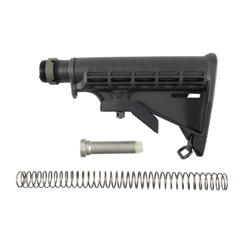 Collapsible buttstock similar to the current US GI M4 carbine stock provides convenient six-position length-of-pull adjustment to fit different-size shooters, including those wearing body armor. Ready to install on any standard AR-15 rifle or carbine lower receiver; includes buffer tube, receiver lock plate, lock nut, toe-mounted steel sling loop, carbine recoil spring and buffer. Buttstock is made from extremely tough, fiberglass-reinforced, injection-molded nylon to resist impact, heat, moisture, extreme cold, and most cleaning solvents. Steel lock nut has four square notches and pre-cut detents for staking to lock plate. Available with Mil-Spec (nominal 1.14" O.D.) receiver extension tube. Stock interior diameter is matched to buffer tube O.D. for a snug fit that eliminates un wanted play and rattles.