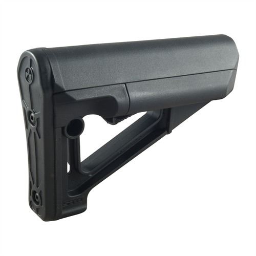 An enhanced version of the Magpul CTR® stock, the STR (“Storage/Type Restricted”) buttstock features two 4¼" left- and right-side positioned battery storage tubes and a wider cheekweld for extra comfort. Rubber caps at the rear keep the storage compartments resistant to water incursion, yet pop off easily for access to two AA or two CR-123 batteries inside. Features two integral 1¼" sling loops. Includes reversible QD swivel socket. Friction locking mechanism minimizes wobble between the buffer tube and the buttstock for a solid, secure "feel", which is enhanced by the detachable .30" thick rubber rubber that adds plenty of "grab" to prevent shoulder slippage.