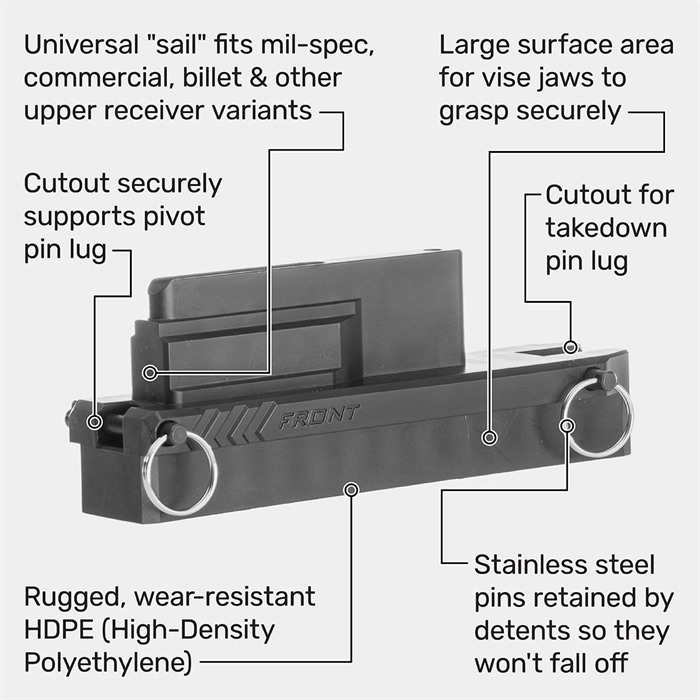 Hergestellt aus hochdichtem Polyethylen (HDPE) mit rostfreien Stiften, hält unser Vise Block einen Upper sicher in einem Werkstattvise, wie dem Brownells Bench Vise, unter Verwendung der mitgelieferten rostfreien Stifte.