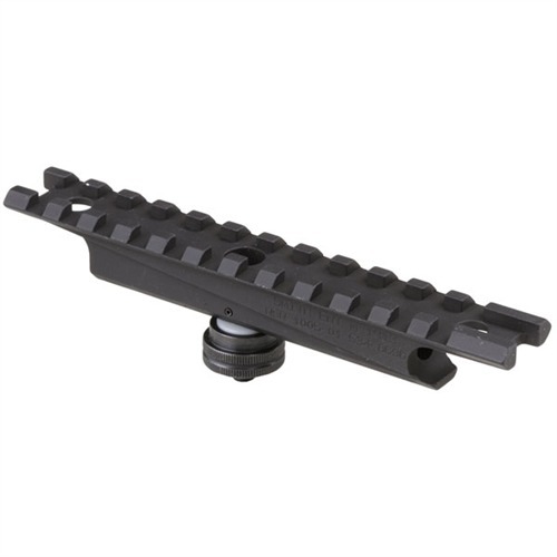 Precision-machined aluminum scope mount attaches securely to the carry handle of your AR-15/M16/M4 to provide a solid, lightweight platform for tactical optics. MIL-STD 1913 rail cut accepts Picatinny, STANAG, and Weaver-style mounting systems, while hollow, .335" diameter sight channel offers unobstructed use of standard-issue iron sights without removing mount. Locks tightly in place with hardened steel stud and knurled nut that also allow fast, easy removal and reattachment of mount and attached optics without loss of zero. Positions scope to provide adequate eye relief when wearing a protective chemical/biological mask. Standard issue for Israeli Defense Forces, and deployed with the U.S. Armed Forces. NSN #1005-01-534-8696.