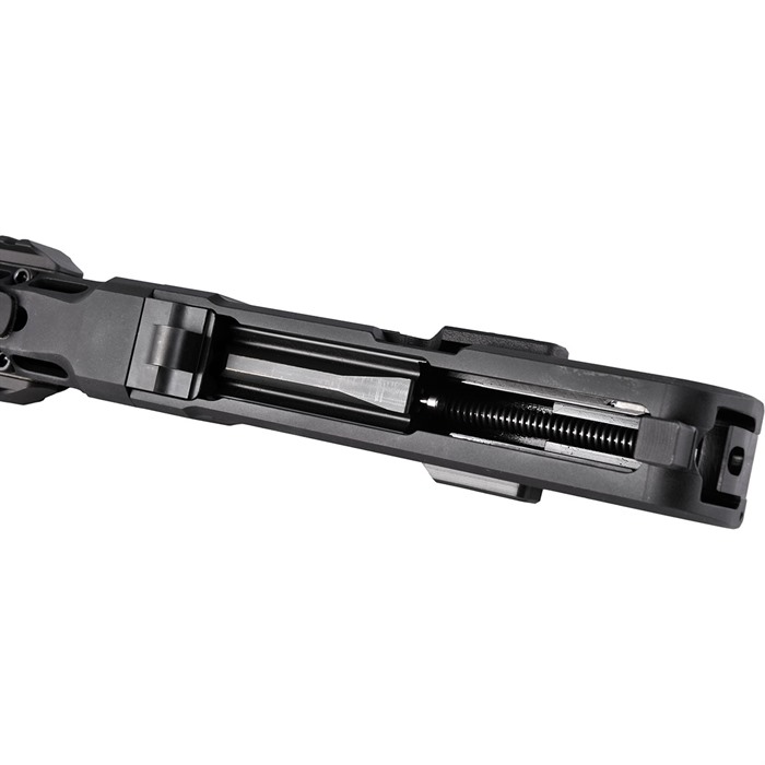- Vollständig bearbeitet: Das Oberteil ist aus einem einteiligen 6061-T6 Aluminiumblock gefertigt und verfügt über eine durchgehende Picatinny-Schiene (Mil-STD-1913) sowie drei zusätzliche Schienen am Mündungsende.