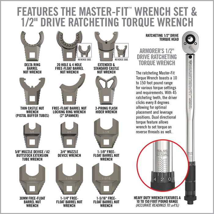 813119014147 ARMORER’S MASTER KIT AR-15 PRO Das Real Avid Armorer's Master Kit AR-15 Pro ist ein fortschrittliches Toolkit, das für AR-15-Enthusiasten und professionelle Büchsenmacher entwickelt wurde und alle notwendigen Werkzeuge zum Bau, zur Anpassung und zur Wartung von AR-15-Gewehren bietet. Beschreibung und Funktionen: Dieses umfassende Kit beinhaltet ein Set von aufgabenbezogenen Crowfoot-Schlüsseln für gängige AR-15-Montagemuttern und einen robusten Armorer’s Drehmomentschlüssel, der präzise Montage und Wartung gewährleistet. Sowohl obere als auch untere Spannblöcke sind enthalten, um deine Feuerwaffenkomponenten während der Arbeit sicher zu halten. Das Kit bietet außerdem ein umfangreiches Set von AR-15-Pin-Punches, einen Armorer’s Hammer und einen 11-Funktions-Bench Block, um verschiedene Montage- und Demontageaufgaben zu erleichtern. Um dir zu helfen, führt ein Schritt-für-Schritt-Anleitungsbuch dich durch die 18 häufigsten Modifikationen, die an AR-15s vorgenommen werden. Spezifikationen: Master-Fit® Wrench Set: Enthält aufgabenbezogene Crowfoot-Schlüssel Master-Fit Torque Wrench: Robuster Drehmomentschlüssel für präzise Drehmomentanwendung Vise Blocks: Lug-Lok™ Oberer Spannblock und Smart-Fit® AR-15 Unterer Spannblock AR-15 Pin Punch Set: Umfassendes Set für verschiedene Pins Accu-Punch® Hammer: Entwickelt für Büchsenmacheraufgaben AR-15 Master Bench Block®: 11-Funktions-Bench Block Anleitungsmanual: Führt durch die 18 besten AR-15-Modifikationen Kundenmeinungen: Kunden schätzen die umfassende Auswahl an hochwertigen Werkzeugen des Kits und stellen fest, dass es wesentliche AR-15-Wartungswerkzeuge effektiv in einem tragbaren und organisierten Paket zusammenführt. Die Präzision des Drehmomentschlüssels und die Aufnahme von feuerwaffenspezifischen Werkzeugen werden häufig als herausragende Merkmale hervorgehoben, die sowohl die Funktionalität als auch den Wert des Kits erhöhen. Die Integration des Real Avid Armorer's Master Kit AR-15 Pro in deine Werkstatt stellt sicher, dass du die spezialisierten Werkzeuge hast, die für die präzise und effiziente Montage und Wartung von AR-15 erforderlich sind, und verbessert sowohl die Qualität als auch die Leichtigkeit deiner Büchsenmacherprojekte.Nachbestellt, Lieferzeit ca. 4-12 Wochen aus dem Lager USA.