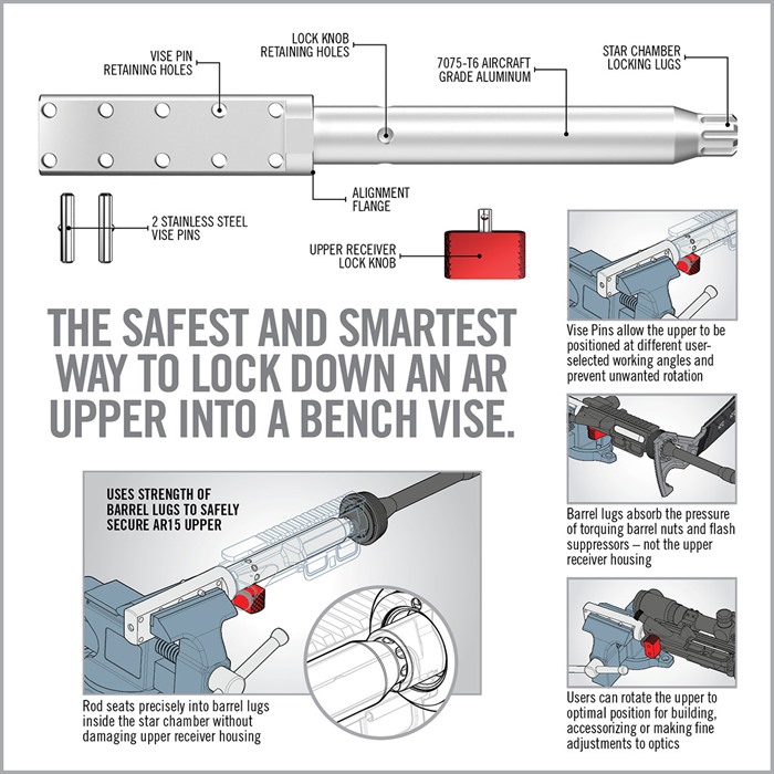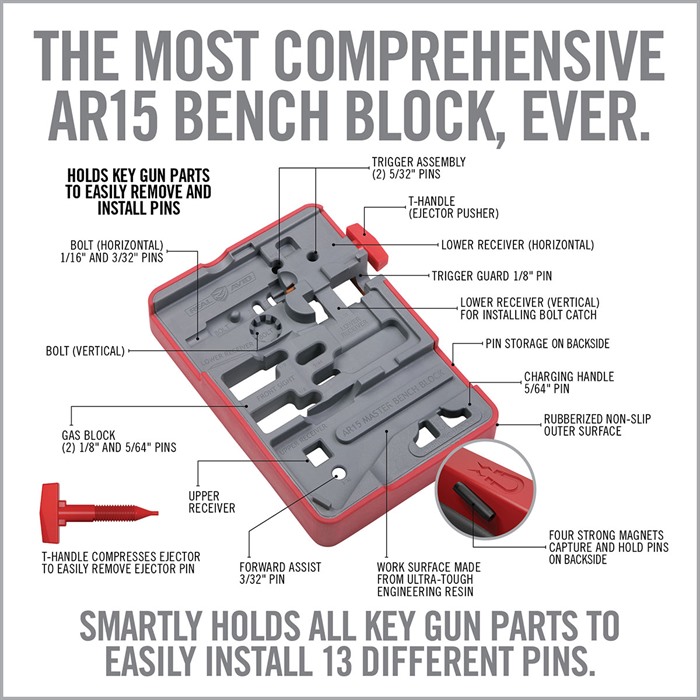 Dieses umfassende Kit enthält eine Reihe von aufgabenbezogenen crowfoot wrenches für gängige AR-15-Montagenüsse sowie einen robusten armorer’s torque wrench, der eine präzise Montage und Wartung gewährleistet. Sowohl obere als auch untere vise blocks sind enthalten, um deine Waffenteile während der Arbeit sicher zu halten. Das Kit bietet auch ein umfangreiches Set von AR-15 pin punches, einen armorer’s hammer und einen 11-function bench block, um verschiedene Montage- und Demontageaufgaben zu erleichtern.