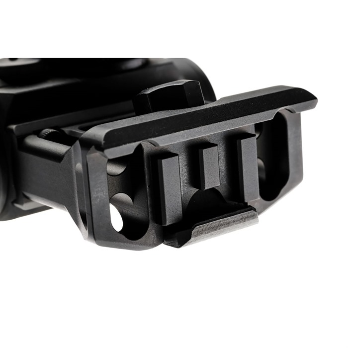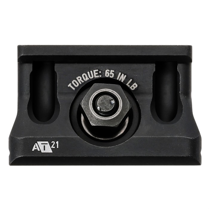 Die A/T (Angled Torque) Montagen verwenden einen patentierten Klammermechanismus, der durch angewinkeltes Drehmoment eine stärkere und zuverlässigere Verriegelung der Montage auf der Schiene des Endbenutzers erzeugt. Um die Hardware unter Feldbedingungen zu halten, verwendet dieses System eine gezahnte Federscheibe, um den Verlust des Drehmoments an der Schraubenmutter zu verhindern. Bei gleicher Last liefert die A/T Montage etwa doppelt so viel Klemmkraft an der Picatinny-Schiene im Vergleich zu einem herkömmlichen horizontalen Interface.