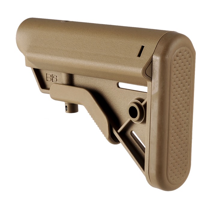 B5 SYSTEMS BRAVO COLLAPSIBLE MIL-SPEC STOCK FOR AR-15 Building upon the success of the B5 Systems Enhanced SOPMOD, B5 has taken the features end users demand; offering them in a lighter, more compact, and stronger buttstock. The Bravo stock maintains the SOPMOD cheek weld, one piece anti-rotation quick disconnect sling mount, non-slip cushioned buttpad, and improved sure grip stock latch. The Bravo omits the storage capability of the SOPMOD to provide a slimmer profile and angles the rear of the stock ensuring quick and consistent stock placement against the shoulder and cheek. Made of Mil-Spec materials and finishes. Currently employed by the U.S. military, this reinforced polymer stock fits M4-type receiver extensions and offers an improved cheekweld designed for increased comfort and consistency. Streamlined contours resist snagging on clothing, equipment, or vegetation to aid in safe and stealthy operation. Sure-Grip stock latch ensures convenient and intuitive length-of-pull adjustment, while the anti-slip rubber recoil pad secures the weapon to the operator’s shoulder. Features a black, stainless steel QD swivel mount and two molded 1¼" wide sling slots. FEATURES Ergonomic Cheek Weld Color-Matched Steel Hardware Fixed Sling Mounts and Steel Anti-Rotational QD Mounts Cushioned Non-slip Buttpad with Built in M4 Multi-Tasker® Tool Holder (tool sold separately) Sure Grip Stock Latch Made of MIL-SPEC Materials and Finishes Fits MIL-SPEC Carbine Receiver Extensions SPECS Weight: 9.3 oz Length: 7.2 in Width: 2 in Height: 4.9 Black and Tan models are TACOM approved and on the Additional Authorization List (AAL) for the M4/M4A1. Black NSN: 1005-01-706-2373 Flat Dark Earth NSN: 1005-01-706-2510