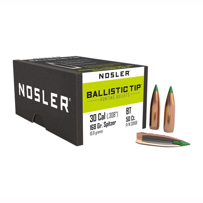 NOSLER BALLISTIC TIP HUNTING 30 CALIBER (0.308") BOAT TAIL RIFLE BULLETS Thriving on ultra-high velocity loads, the Ballistic Tip® Varmint bullet offers devastating performance at distances both near and far. The aerodynamic polymer tip (color coded by caliber) combined with the ultra-thin jacket mouth assures rapid and violent expansion at either end of the velocity scale. The bullet is equipped with a gradually thickening jacket wall that provides maximum energy transfer and optimum weight retention while the ballistically-engineered Solid Base® acts as a platform for large diameter mushrooms. No matter the rifle/cartridge combination you’re shooting or what varmint you’re shooting at, Nosler Ballistic Tip® delivers match-grade accuracy with all the performance characteristics serious varmint hunters are looking for. FEATURES: Polymer Tip Streamlined tip color coded by caliber. Ultra-Thin Jacket Mouth Assures violent expansion at either end of the velocity scale. Uniform Gradual Thickening The uniform, gradual thickening is designed to keep the bullet together until impact at any velocity. Ballistically Engineered Solid Base Boat tail configuration combines with the streamlined polymer tip for extreme long-range performance and easier loading.