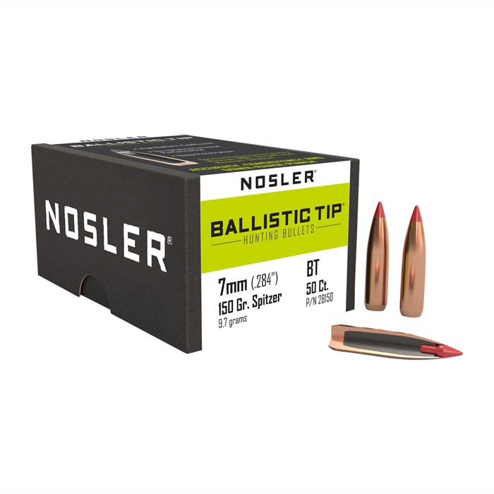 NOSLER BALLISTIC TIP HUNTING 7MM (0.284") BOAT TAIL RIFLE BULLETS Thriving on ultra-high velocity loads, the Ballistic Tip® Varmint bullet offers devastating performance at distances both near and far. The aerodynamic polymer tip (color coded by caliber) combined with the ultra-thin jacket mouth assures rapid and violent expansion at either end of the velocity scale. The bullet is equipped with a gradually thickening jacket wall that provides maximum energy transfer and optimum weight retention while the ballistically-engineered Solid Base® acts as a platform for large diameter mushrooms. No matter the rifle/cartridge combination you’re shooting or what varmint you’re shooting at, Nosler Ballistic Tip® delivers match-grade accuracy with all the performance characteristics serious varmint hunters are looking for. FEATURES: Polymer Tip Streamlined tip color coded by caliber. Ultra-Thin Jacket Mouth Assures violent expansion at either end of the velocity scale. Uniform Gradual Thickening The uniform, gradual thickening is designed to keep the bullet together until impact at any velocity. Ballistically Engineered Solid Base Boat tail configuration combines with the streamlined polymer tip for extreme long-range performance and easier loading.