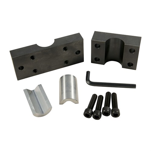 Blöcke - Stahl, brüniert. Oberer Block - 4-1/2" (11,4 cm) x 3" (7,6 cm) x 1-1/2" (3,8 cm). Unterer Block - 7" (17,7 cm) x 3" (7,6 cm) x 1-1/8" (2,8 cm). Enthält 4, 1/2"-20 x 2" Innensechskantschrauben. Der untere Block ist für 1/2" Durchmesser Montageschrauben gebohrt und versenkt. Buchsen - C.R.S. Stahl, blaue Oberfläche oder 6160 Aluminium, natürliche Oberfläche. Alle Buchsen sind 3" lang, -13/4" Durchmesser. #4, 7, 8, 9, 10 und 11 sind in einem Bereich von I.D.s erhältlich, um eng mit den Schaftdurchmessern der meisten Gewehrläufe übereinzustimmen. #5 passt auf militärische Mauser 98 Läufe. #6 ist konisch geformt, um auf Remington Werk .30-06 Sporter und andere ähnliche Profil-Läufe zu passen. #12 & 13 sind ein speziell gefertigtes Set von Buchsen für Standard- und schwere M14/M1A/M1 Garand Läufe. #15 ist für den FN FAL Lauf. #16 ist eine Aluminium-Buchse für ¾" oktagonale Läufe. Stahl- und Aluminium-Barrel Vise Sets sind komplett mit den vier ½"-20 tpi x 2" Innensechskantschrauben, einem Innensechskantschlüssel und den Buchsen #4, #6, #7, #8, #9, #10 und #11. (Buchsen #5, 12, 13, 14, 15 und 16 müssen separat gekauft werden.)