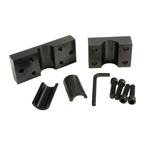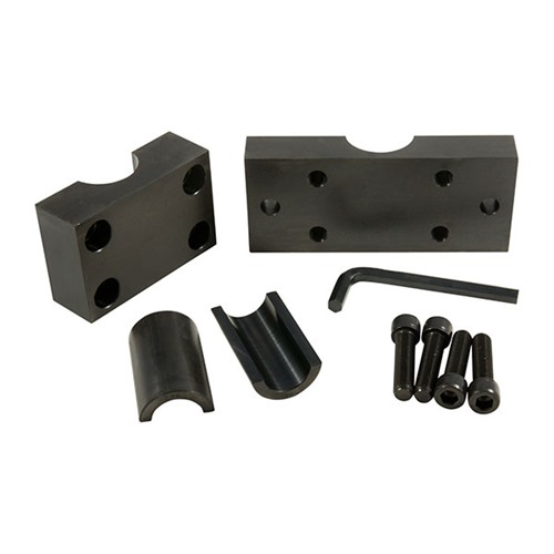 Blöcke - Stahl, blued. Oberer Block - 4-1⁄2" (11,4 cm) x 3" (7,6 cm) x 1-1⁄2" (3,8 cm). Unterer Block - 7" (17,7 cm) x 3" (7,6 cm) x 1-1⁄8" (2,8 cm). Enthält 4, 1⁄2"-20 x 2" Innensechskant-Schrauben. Der untere Block ist für 1⁄2" Durchmesser Montageschrauben gebohrt und versenkt. Bushings - C.R.S. Stahl, blaue Beschichtung oder 6160 Aluminium, natürliche Oberfläche. Alle Bushings sind 3" lang, -13⁄4" Durchmesser. Die Größen #4, 7, 8, 9, 10 und 11 entsprechen den Durchmessern der meisten Gewehrläufe. Die Größe #5 passt auf militärische Mauser 98 Läufe. Die Größe #6 ist konisch geformt für Remington Fabrik .30-06 Sporter und andere ähnliche Profile. Die Größen #12 & 13 sind ein speziell bearbeitetes Set von Bushings für Standard- und schwere M14/M1A/M1 Garand Läufe. Die Größe #15 ist für den FN FAL Lauf. Die Größe #16 ist ein Aluminium-Bushing für ¾" oktagonale Läufe.