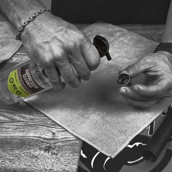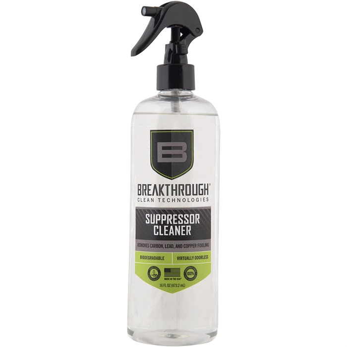SUPPRESSOR CLEANER The Breakthrough Clean Technologies Suppressor Cleaner is a water-based, ammonia-free cleaner that removes heavy carbon and lead deposits. Utilizing a proprietary blend of chemical surfactants and detergents, this cleaner effectively neutralizes all corrosive residues, preventing damaging rust and corrosion without etching or harming your suppressor. With no noxious fumes or hazardous chemicals, the suppressor cleaner is a safe and effective choice for removing stubborn carbon and lead build-up in your suppressor. FEATURES: SUPPRESSOR CLEANING SUPPLIES: Our carbon remover is a water-based cleaner that dissolves heavy carbon and lead deposits on a firearm's suppressor. It neutralizes all corrosive residues and temporarily protects against rust and corrosion. FIREARM ACCESSORY CARE AND MAINTENANCE: Our premium degreaser helps keep your gun accessories in peak condition and top-notch performance. It is petroleum and ammonia-free. SUPERIOR QUALITY: Utilizing a proprietary blend of chemical surfactants and detergents, this cleaner prevents the build-up of rust and corrosion without etching or harming the suppressor's surface. MULTI-PURPOSE DEGREASER: This carbon cleaner works with aluminum, stainless steel, and titanium-based suppressors. BREAKTHROUGH CLEAN: We offer the finest line of products to safely and efficiently maintain your equipment. Our cleaners eliminate more contaminants than the leading competitors, and our lubricants provide the ultimate protection from the elements. *Prolonged contact with Cerakote or Anodized metal may cause discoloring. Always test a small area to ensure product will not harm surface.