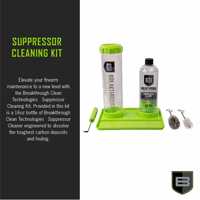 SUPPRESSOR CLEANING KIT Elevate your firearm maintenance to a new level with the Breakthrough Clean Technologies® Suppressor Cleaning Kit. Provided in this kit is a 16 oz bottle of Breakthrough Clean Technologies® Suppressor Cleaner engineered to dissolve the toughest carbon deposits and fouling. The kit features a Soaking Tube for complete submersion of suppressor parts for a thorough cleaning process, leaving no residue or buildup behind. Two meticulously designed brushes help reach tough spots of your suppressor, removing stubborn fouling and carbon buildup. The retrieval tool is used to safely and easily put in and extract the suppressor in and out of the soaking tube. The kit is provides a storage tray to keep every essential tool in its designated place. Investing in the Breakthrough Clean Technologies® Suppressor Cleaning Kit isn't just a choice—it's a commitment to the long-term health and functionality of your suppressor-equipped firearms, empowering you to keep your firearms operating at their absolute best, shot after shot. FEATURES: ALL-IN-ONE SUPPRESSOR CLEANING KIT: Provides effortless suppressor cleaning process with a comprehensive kit that includes everything you need for thorough maintenance—Pack includes (1) 16oz. Suppressor Cleaner, (1) Soaking Tube, (2) Specialized Brushes, (1) Retrieval Tool, & (1) Organized Tool Tray. HIGH-PERFORMANCE SUPPRESSOR CLEANER: Provided in the kit is a 16 oz bottle of Breakthrough Clean Technologies® Suppressor Cleaner, known for its exceptional cleaning power. COMPATABILITY: Fits suppressors up to 2.375” in diameter and 8.5” in length. SOAKING TUBE INCLUDED: A Soaking Tube ensures optimal cleaning by allowing the suppressor components to be fully immersed for deep and thorough cleansing. SPECIALIZED BRUSHES: Two precision-engineered brushes are included to effectively remove carbon buildup and fouling, ensuring your suppressor operates in fullest potential. RETRIEVAL TOOL: This kit provides a specialized retrieval tool to extract cleaning patches & components safely & easily from the suppressor. ORGANIZED CLEANING TRAY: Keep all your cleaning tools in one place with the included organized tray, making maintenance sessions convenient & hassle-free. DURABLE & RELIABLE: Each component of the kit is constructed with high-quality materials, ensuring longevity & consistent performance in maintaining your suppressor. ENHANCED SUPPRESSOR PERFORMANCE: Regular use of this kit helps ensure your suppressor functions optimally, prolonging its lifespan and preserving its effectiveness in the field. *Do not submerge suppressors with aftermarket finishes. SPECIFICATIONS: Material: ABS Plastic Product Length: 6.5 Product Width: 3.75 Product Height: 9.5 Product Weight: 0.5