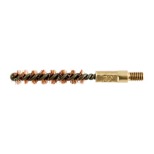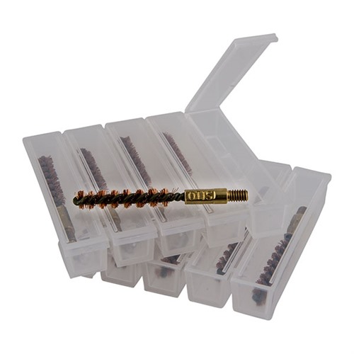 SPECS: Messingdrahtschaft, Bronze- oder Nylonborsten. Ca. 21⁄8" (5.4cm) lang. Standard 8-32 tpi Gewinde. Pistol-/Gewehrbürsten werden im 10er-Pack verkauft, jede Bürste in einem einzelnen Plastikrohr.
