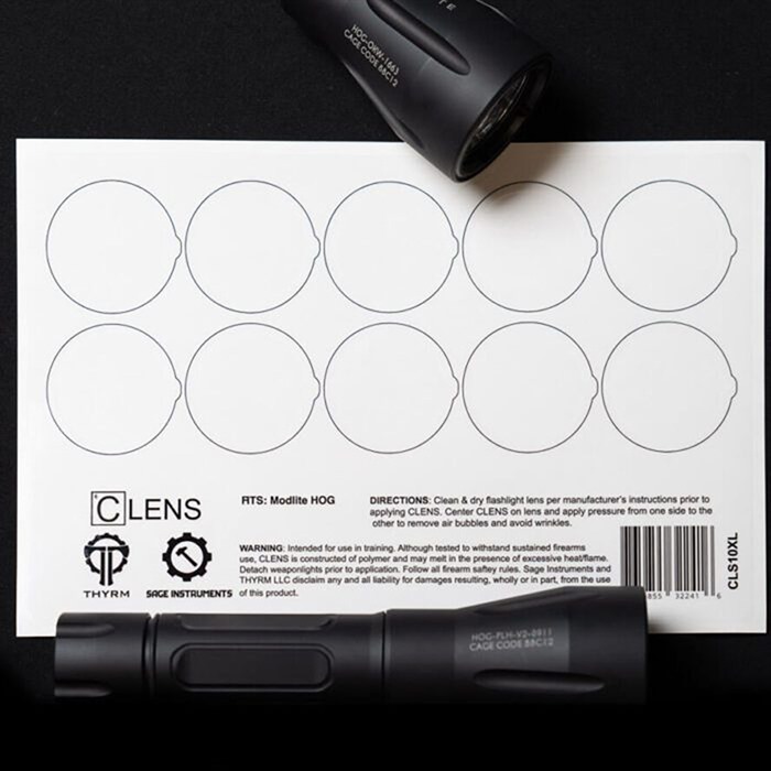 - CLENS (ausgesprochen „cleanse”) kommt als Set von hitzebeständigen klaren Polymerkreisen, die passend für eine Vielzahl von Taschenlampen- und Waffenlichtlinsen zugeschnitten sind.