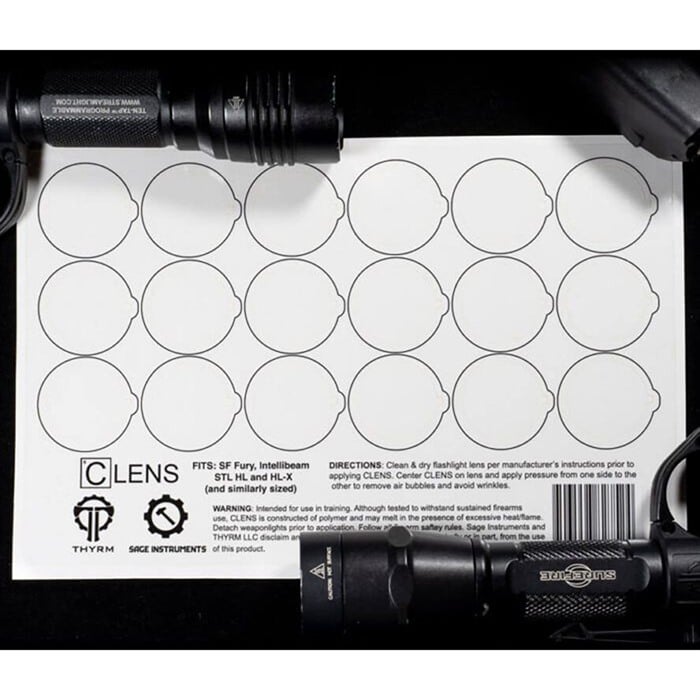 CLENS LENS PROTECTION FOR FLASHLIGHTS AND WEAPON LIGHTS Lights only work well when their lenses are clean. Each CLENS Protector provides an easy way to protect lenses during extended shooting sessions. Just like goggle tear-offs for off-road riding, just remove the dirty CLENS to return your light to its optimal brightness. CLENS (pronounced “cleanse”) come as a set of heat-resistant clear polymer circles, cut to fit on a wide range of flashlight and weapon-light lenses. Each CLENS Protector protects the lens from carbon and other debris that can build up during firearms training. Each CLENS Protector has a small tear-away tab. The CLENS Protector can be removed to quickly clean a light, rather than having to apply Vaseline before shooting, replace a lens, or risk abrasion with lens cleaners. Each CLENS’ mild adhesive backing has a higher affinity for polymer than glass. Attach and position easily, without leaving adhesive on clean glass. However, the adhesive may stick to a dirty or damaged lens. In this case, touching the sticky side of the CLENS to any residual adhesive should remove the adhesive from the lens. Designed and manufactured in the USA. * Follow all firearm safety rules at all times. Detach lights from firearms prior to installing, removing, cleaning, or replacing the CLENS.