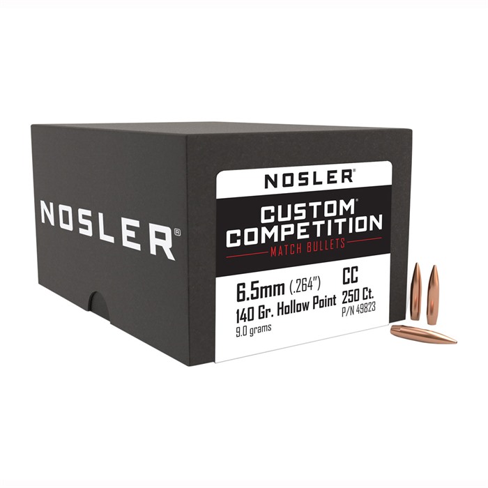 CUSTOM COMPETITION 6.5MM (0.264") HOLLOW POINT BOAT TAIL RIFLE BULLETS Blending the accuracy of Nosler Custom Competition bullet jackets with our own ultra-precise, lead-alloy cores, we’ve created one of the most accurate match rifle bullets on the market. The hollow point provides a small meplat for reduced drag and increased aerodynamic efficiency while the pronounced boat-tail design provides exceptional flight characteristics over a wide range of velocities. Engineered to exhibit unmatched accuracy, the custom quality jacket form-fits the lead-alloy core for maximum bullet stability and balance. Hand-inspected for quality assurance, Nosler Custom Competition bullets rival all others on the range. FEATURES: Hollow Point Custom Quality Jacket Form-Fitted, Lead-Alloy Core Pronounced Boat-Tail Design