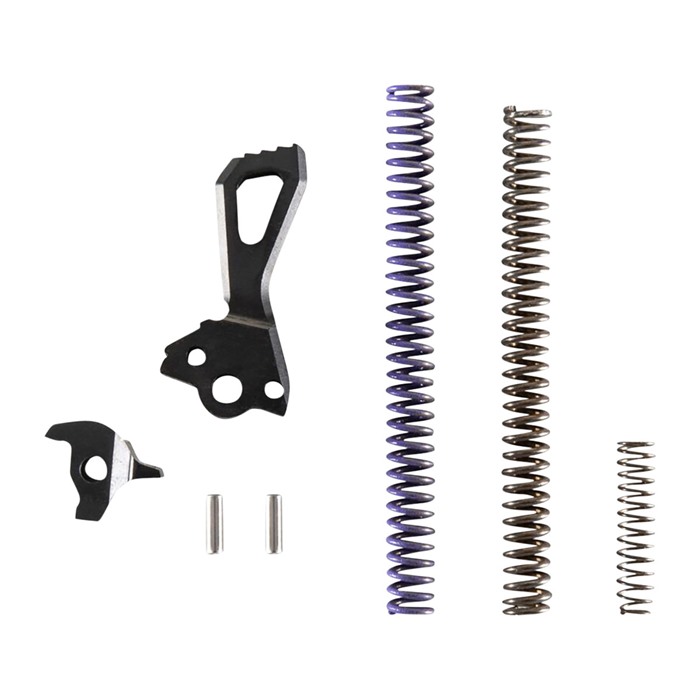 Wenn die Carry Mainspring verwendet wird, beträgt der Double-Action-Zug 7 Pfund, während der Single-Action-Zug 5 Pfund misst. Bei Installation der Competition Mainspring sinkt der Double-Action-Zug auf 6 Pfund, während der Single-Action-Zug 4,5 Pfund beträgt.